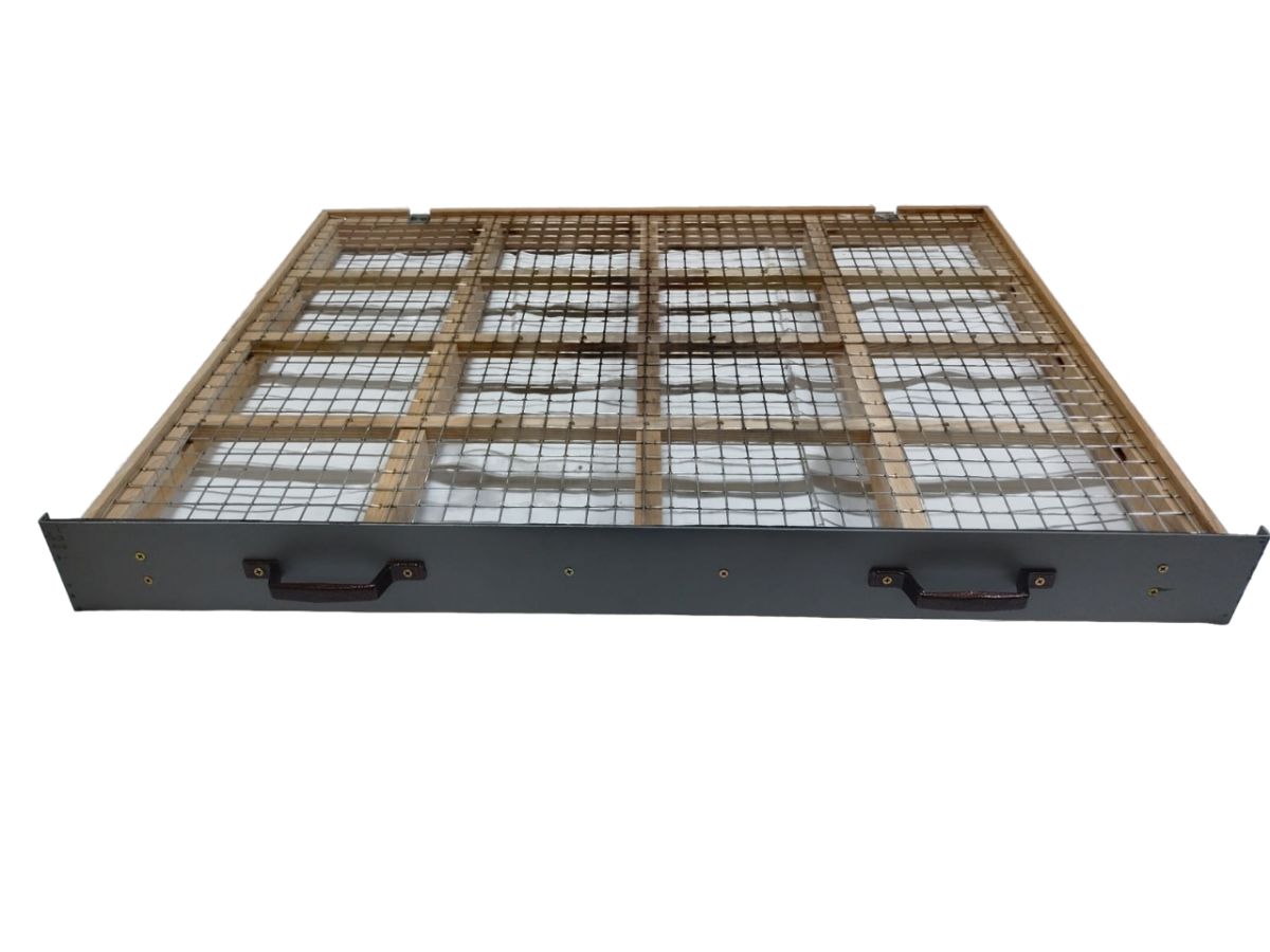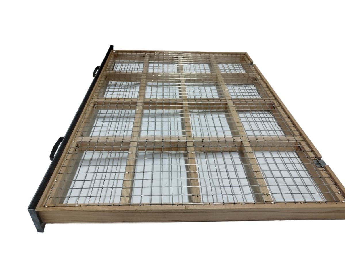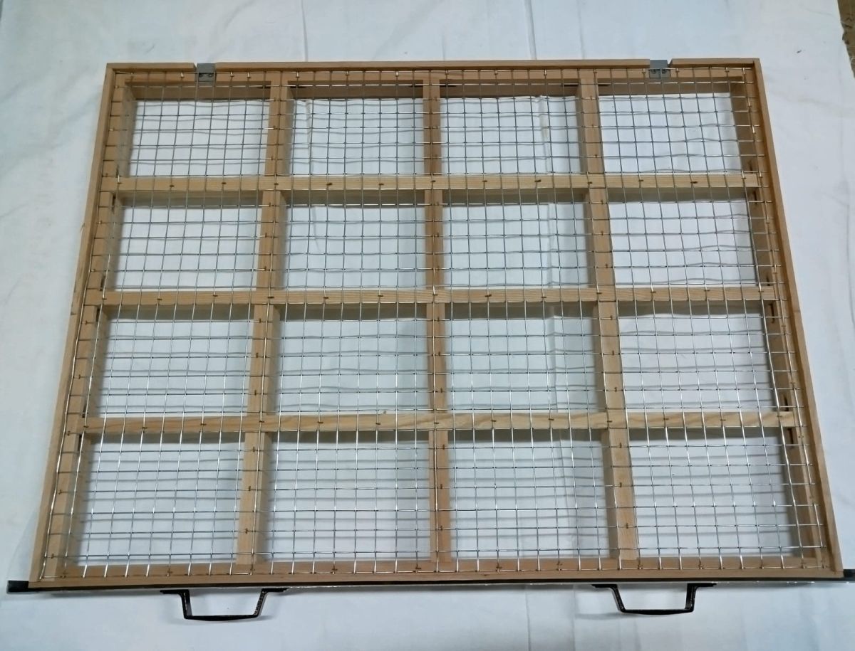 Рамка состоит из: деревянной рамки с нижней поддерживающей сеткой (ячейка 25*25 мм), на передней стенке металлическая планка (2 мм), ручки, замки на соединение передней и задней рамок.